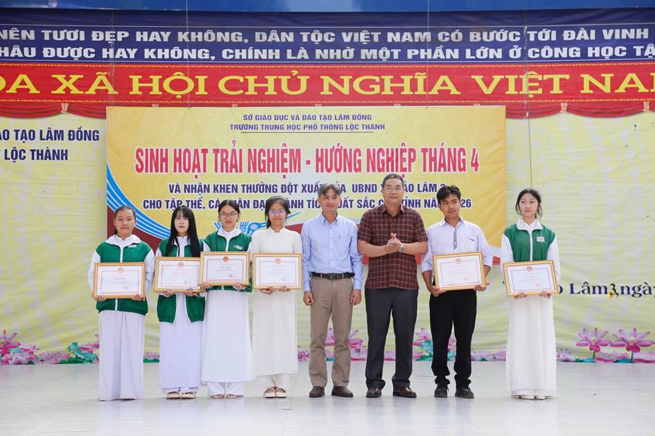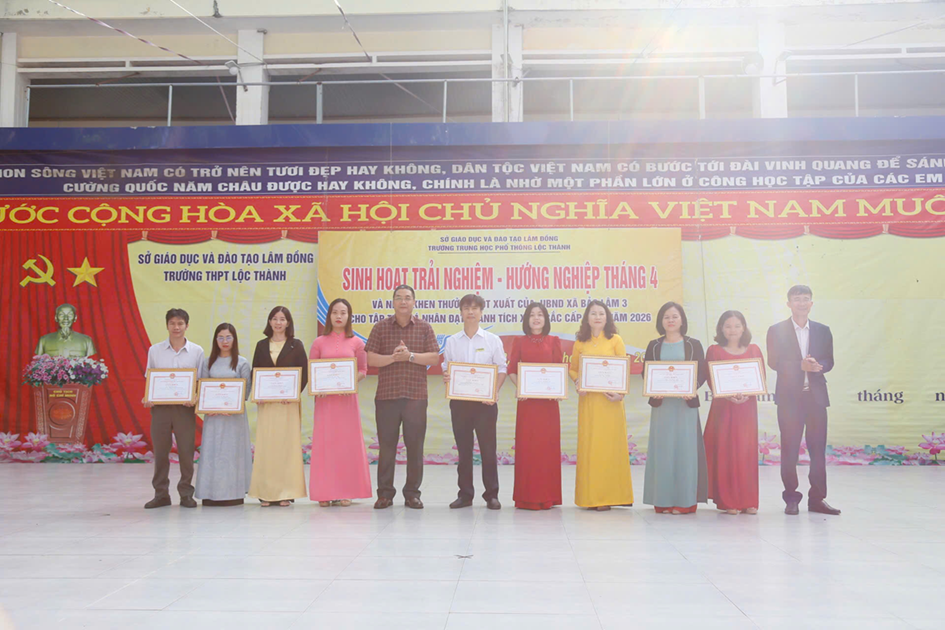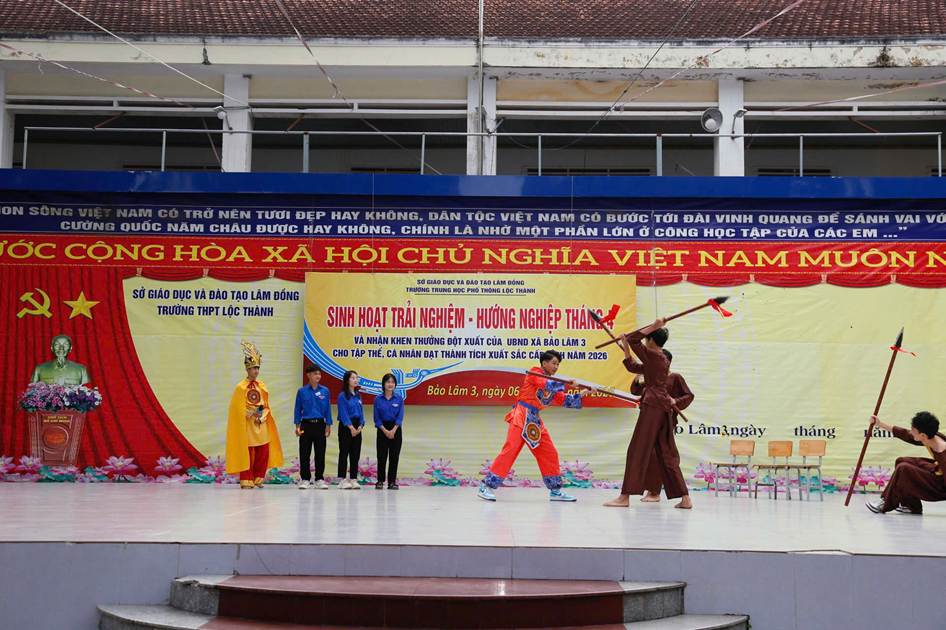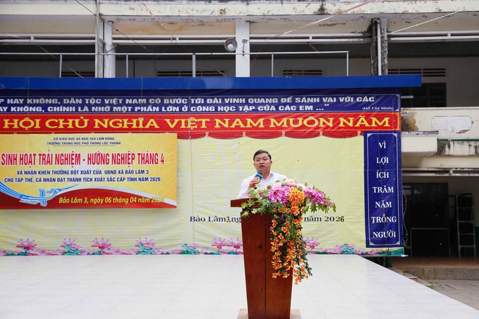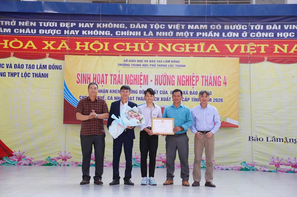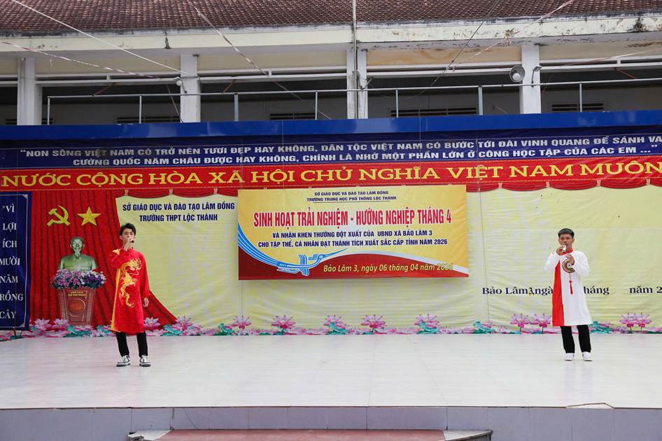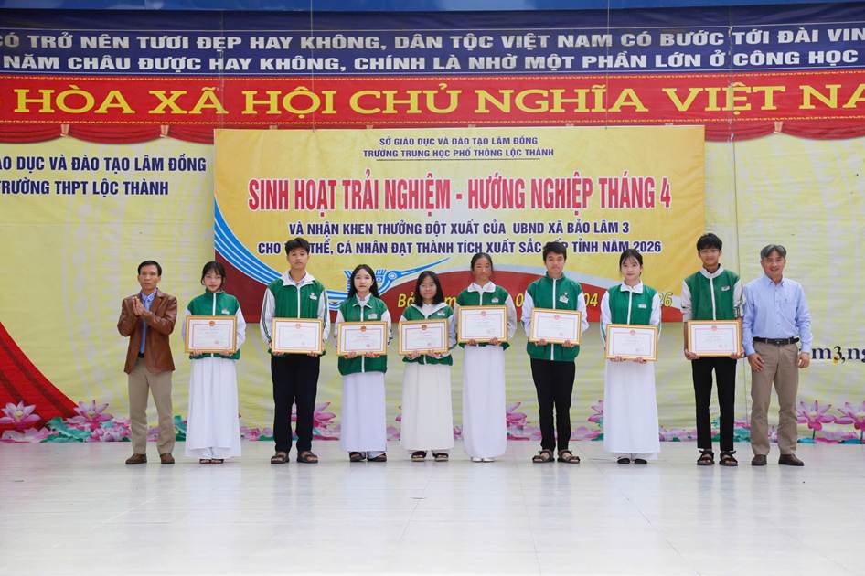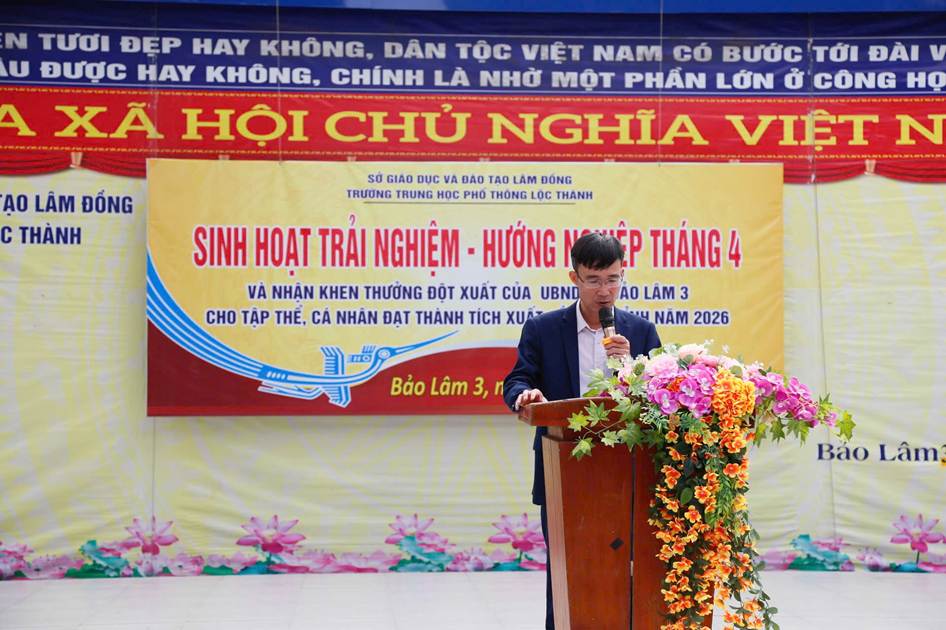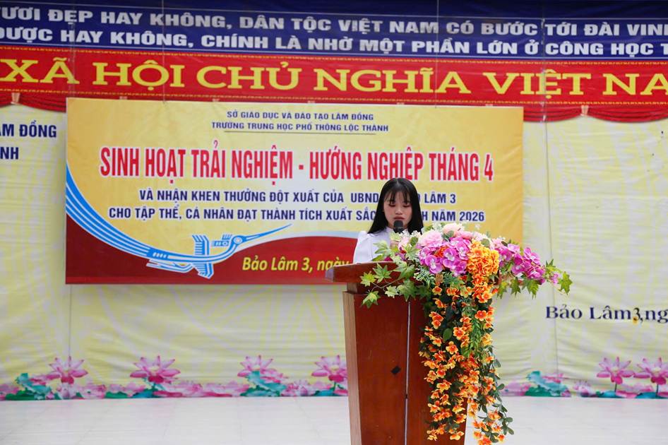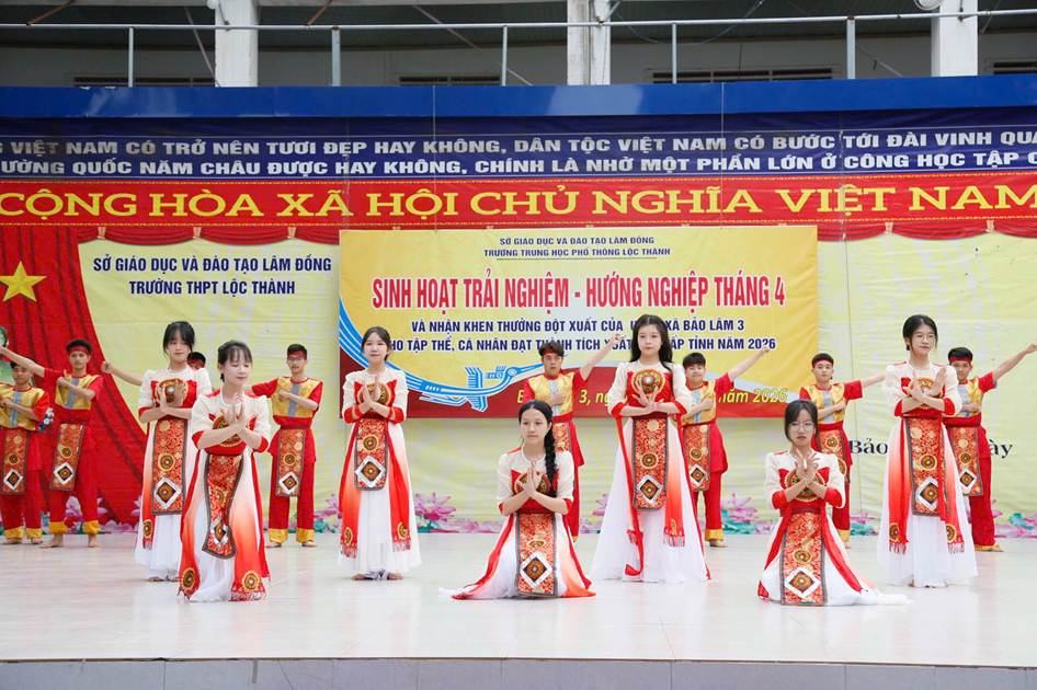 Sáng ngày 06/04/2026, trường THPT Lộc Thành đã tổ chức chương trình sinh hoạt dưới cờ kết hợp hoạt động trải nghiệm với chủ đề: “Giỗ Tổ Hùng Vương – Một lần thức tỉnh”. Nổi bật trong buổi sinh hoạt là nội dung tuyên dương, khen thưởng đột xuất của UBND xã Bảo Lâm 3 cho tập thể và cá nhân đạt thành tích xuất sắc cấp Tỉnh năm 2026.